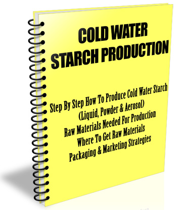 From Zillion Ztanmac Global Limited Dear Friend, Cold water starch is used to stiffen clothes and fabrics. It is used in cold water at room temperature on the fabric to be treated. Production of cold water starch is a lucrative business due to high demand for it. Cold water starch is easy to use; it does not require boiling water to prepare it, this has made it a darling to starch users and launderers. The raw materials for producing it are affordable and readily available in the market. You can produce it anywhere and space is not a problem because it can be produced in your house or backyard. You don't need any costly equipment you only need containers for mixing and the mixing is done manually. This cold water starch production ebook will show you step by step how to produce cold water starch. Two types of cold water starch (liquid & aerosol) are discussed in details including the the raw materials and where to get them. This ebook will also show you how best to package your starch and market it. You are covered by our 100% money back guarantee which means if you buy this ebook and you cannot produce cold water starch after implementing our formulations, just ask for your money and it will be refunded. What You Will Learn From This E-book